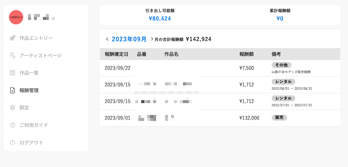 作品のステータスと報酬額が、アーティストマイページで確認出来るようになります。