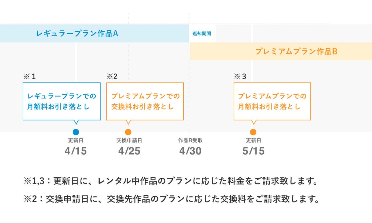 交換利用料は、交換先の作品のプランに準じます。例えば、現在レンタル中のレギュラープラン作品からライトプラン作品に交換する場合は、交換申請時にライトプランの交換利用料が発生します。