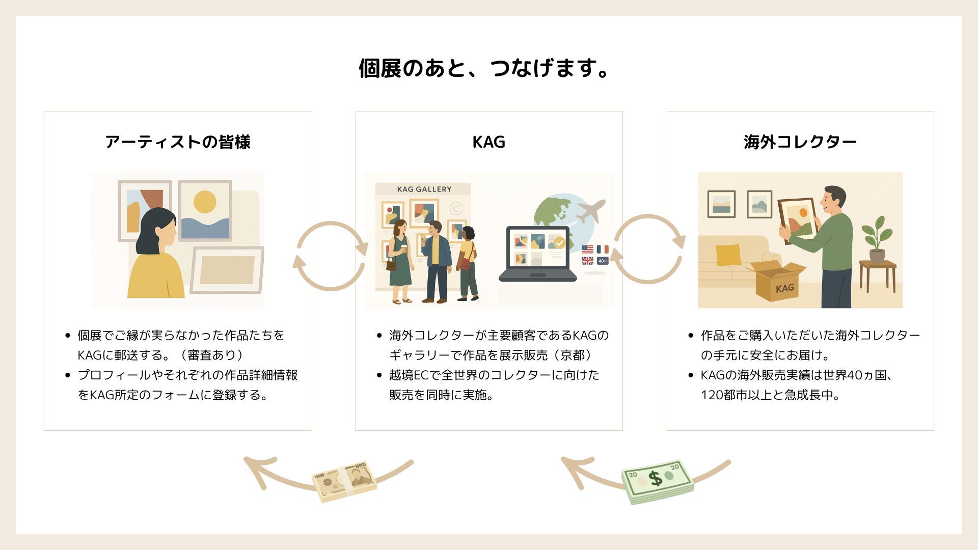- KAGが撮影・翻訳を行い、越境ECへの掲載準備を行います。 また、京都にあるKAGギャラリーでも作品を展示し、主に海外から来られるコレクターの方々に紹介します。