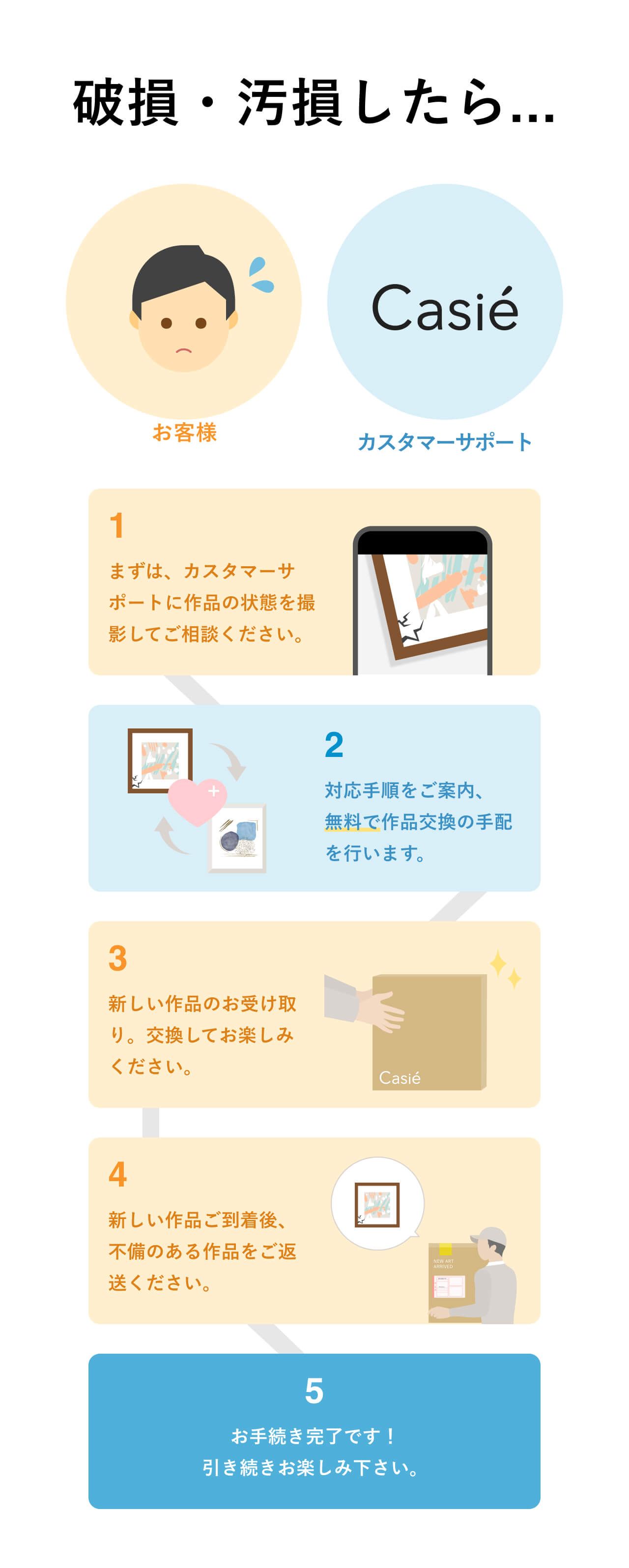 破損・汚損のためにそのまま作品をお楽しみいただけない場合は、すぐに無料交換させていただきます。交換の手順や方法は、破損・汚損のご報告をいただいた際に、個別にご案内いたします。